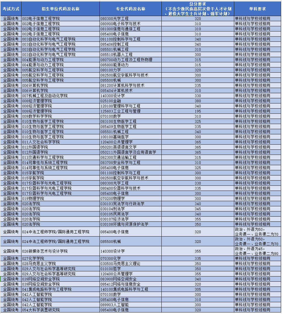 4、一志愿报考以下招生单位相应专业的考生请注意,其在学校复试资格基本线要求的基础上,提高了进入相应专业复试的全国统考方式(不含少数民族高层次人才骨干计划和退役大学生士兵计划)初试成绩的要求。